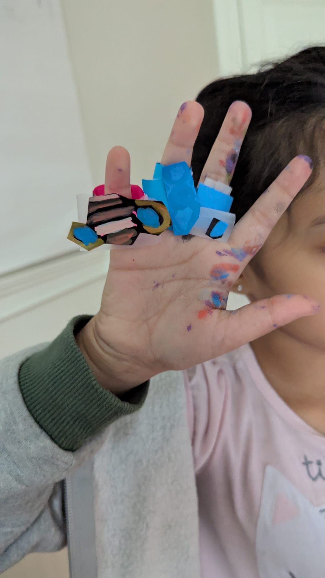 Siana made her own "solar system" finger stickers with tape and scissors at home.