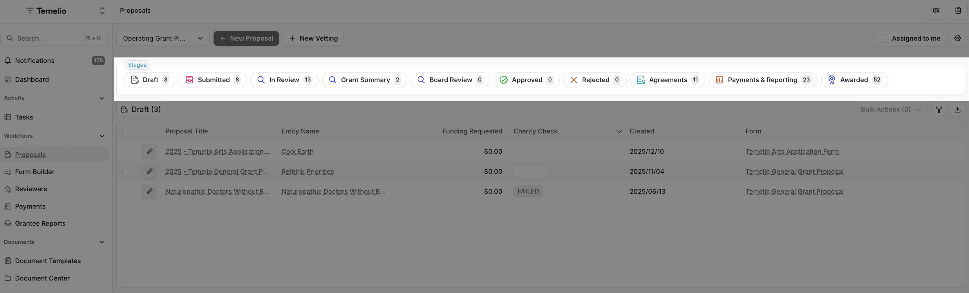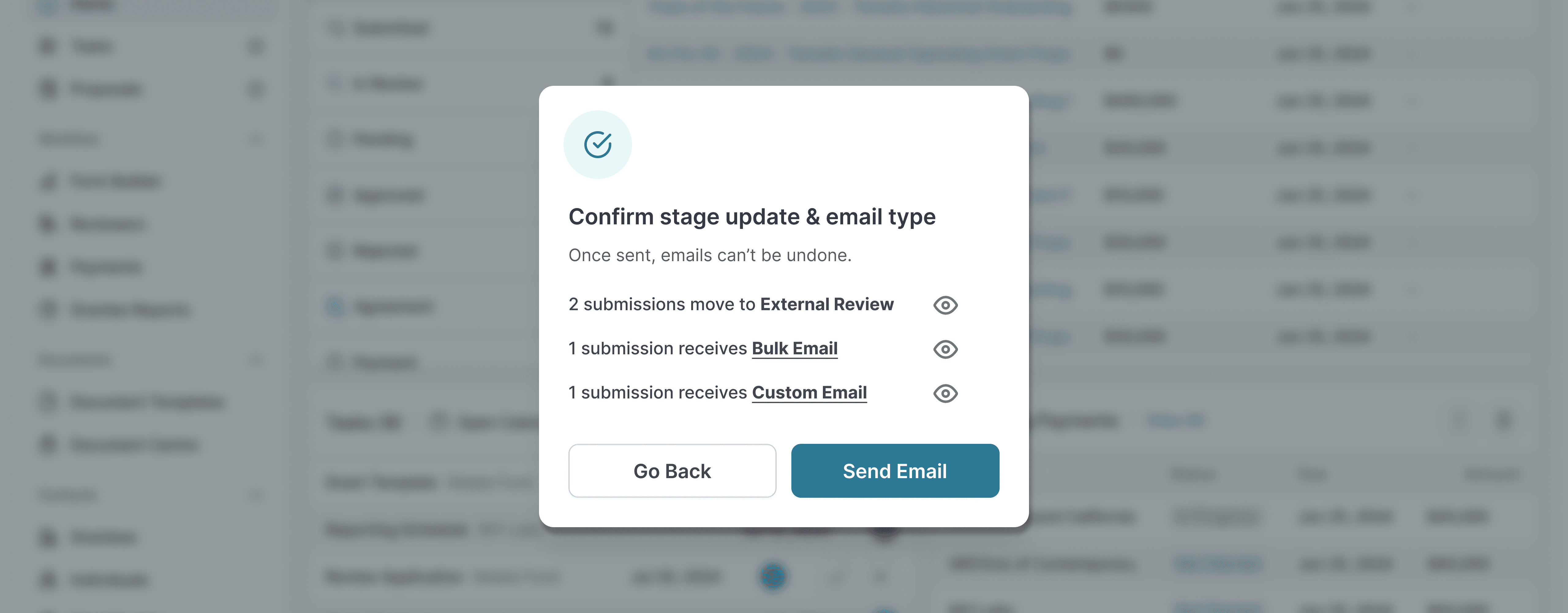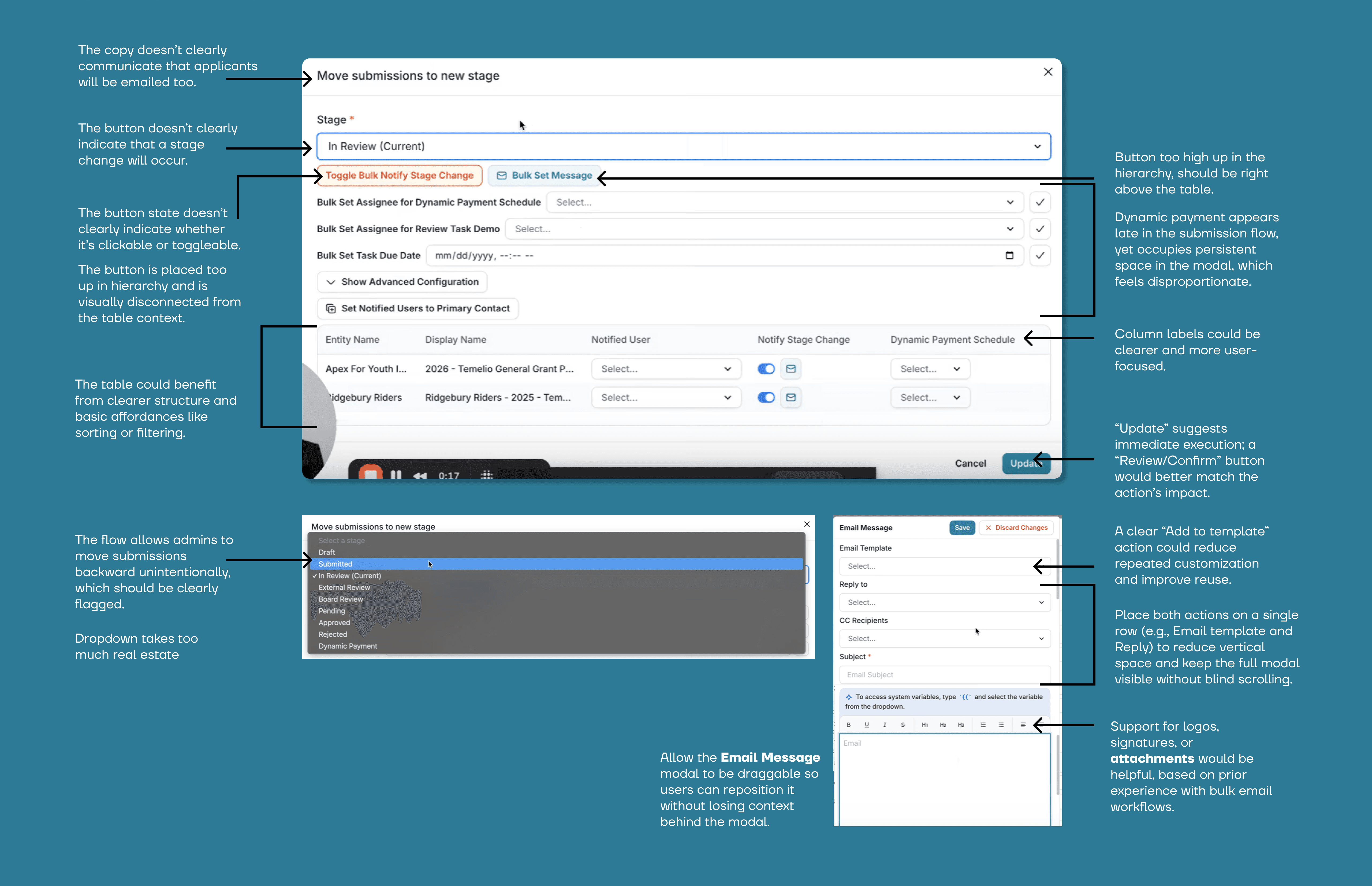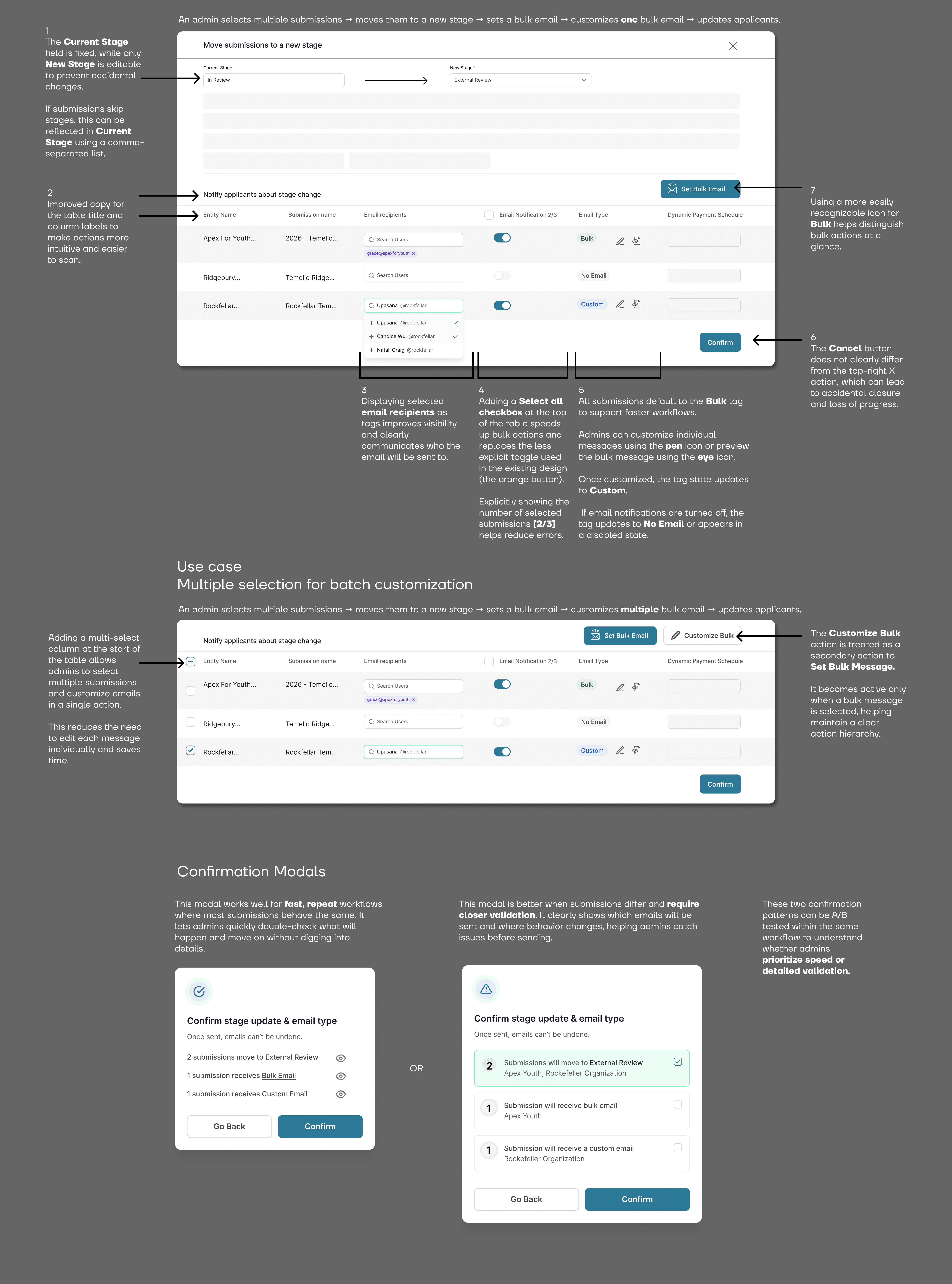 Temelio helps teams manage grant submissions across stages, where each stage change triggers an email to applicants. These actions are high-impact and irreversible, making every update a critical decision. Limited visibility and control made this process feel risky, reducing confidence at the point of action.