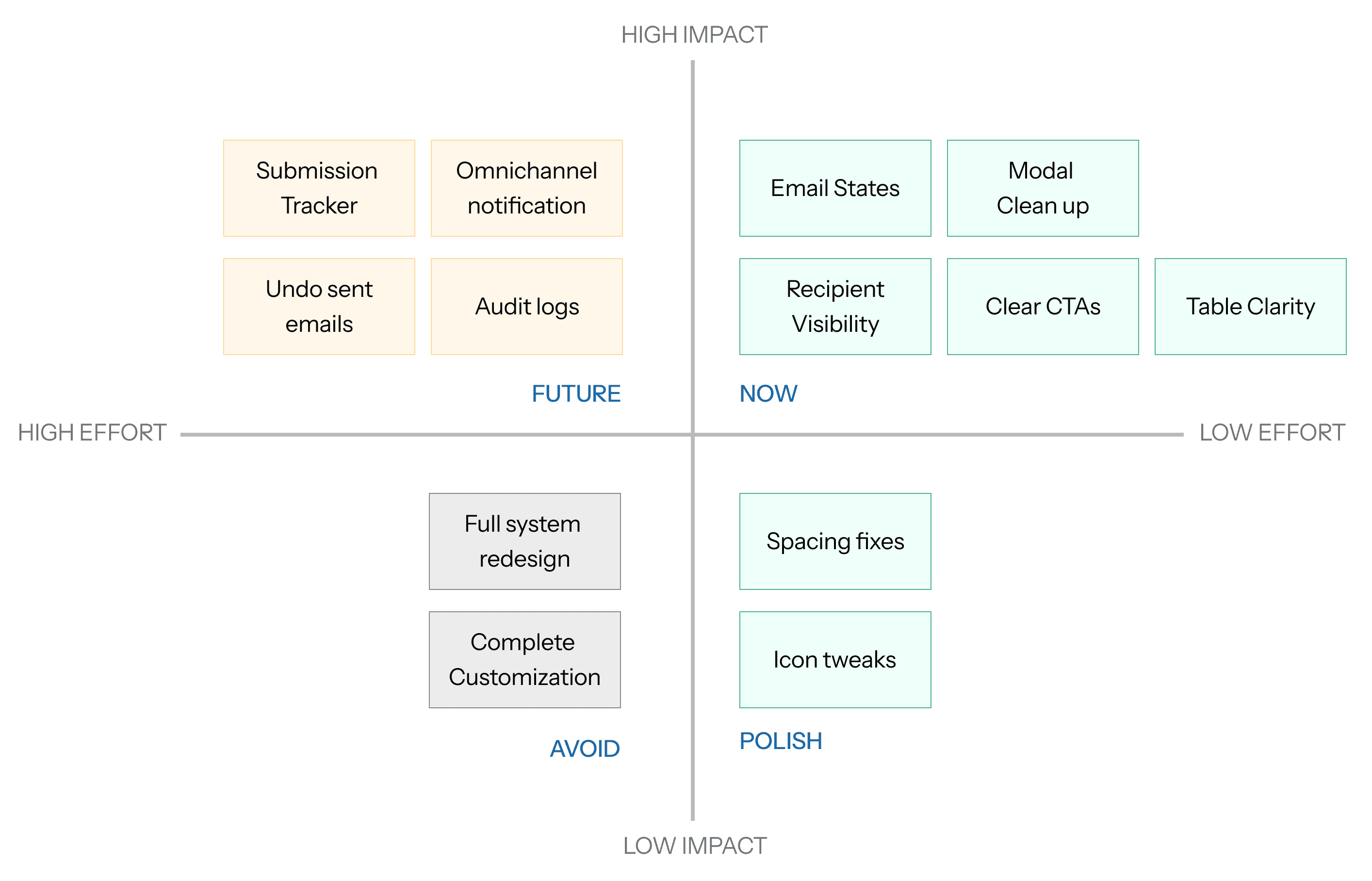 Given the irreversible nature of email actions, the focus was on reducing risk and improving clarity without slowing down bulk workflows. Improvements were prioritized based on impact vs effort, optimizing the existing modal for immediate gains, while deferring larger structural changes to future iterations.